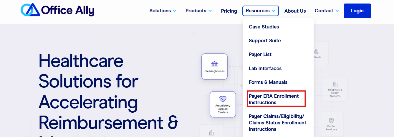 For each one of your payers, you will want to go to Office Ally’s website (officeally.com) select the 'Resource center', and then select Payer ERA Enrollment Instructions.