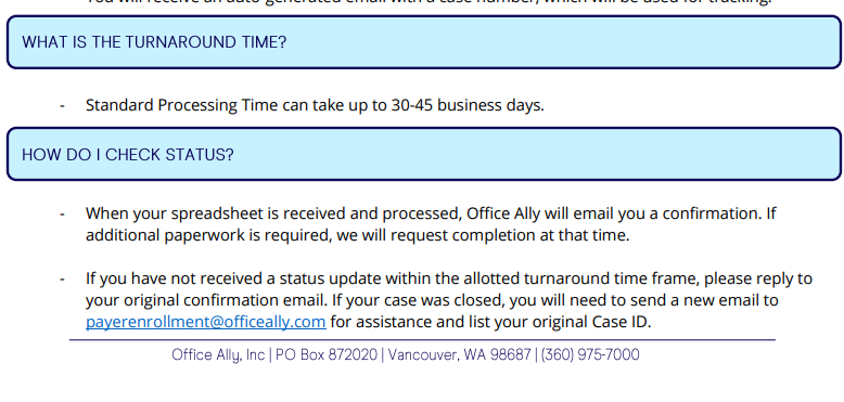 Once you have submitted the form, it will take some time for the form to process and for you to start receiving ERAs in your Theralytics Database. Most forms will have information on them relating to a turnaround time on when you should expect to start receiving ERAs, as well as who to reach out if you want to check the status of the enrollment (example below).